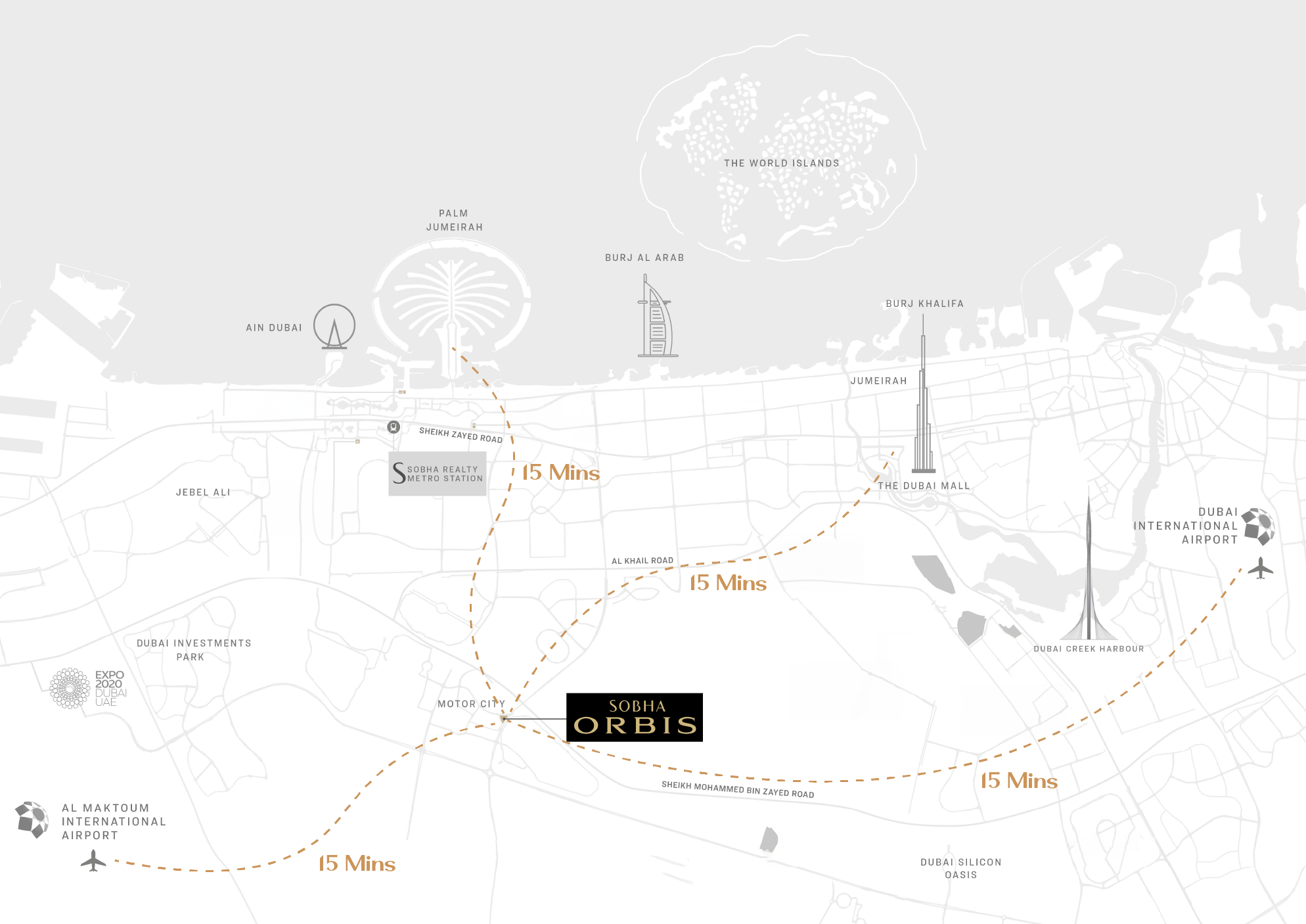 From its sleek architectural design to its sumptuous interior finishes, every facet of Sobha Orbis is meticulously curated to evoke a timeless aura of luxury. Dive into the refreshing waters of our resort-style pool, unwind in the serene ambiance of our landscaped gardens, or stay active in the state-of-the-art fitness center. It is conveniently located just a minute away from both Mohammed bin Zayed Road and Al Qudra Road, ensuring easy accessibility to key destinations.